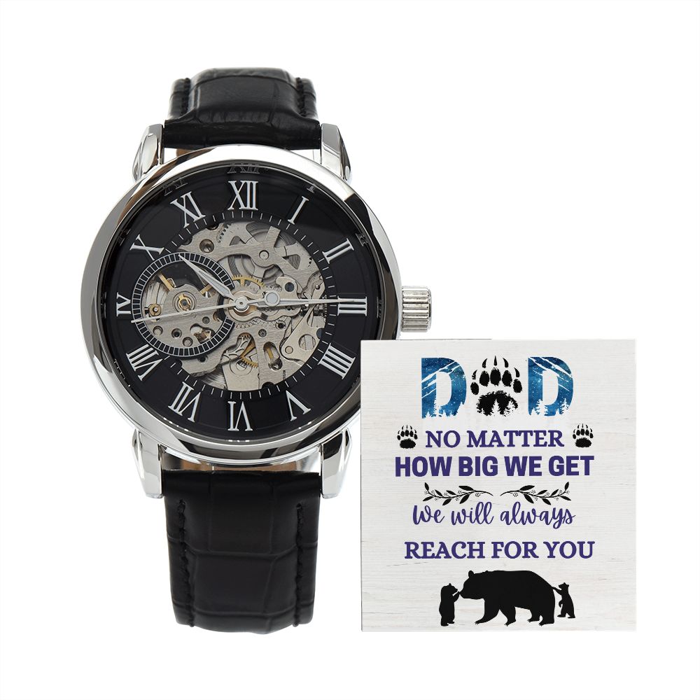 Give the gift of luxury with this handsome and daring timepiece. The Men's Openwork Watch is the perfect blend of classic design and modern styling, making it an essential accessory for your remarkable style. This watch sports a genuine leather strap, is splash resistant, and has increased durability thanks to hardened mineral glass. Our unique skeleton dial feature allows you to peer directly into the inner workings of your watch. Beautifully crafted to be automatic, this watch requires motion instead of batteries. You will keep precise time simply by wearing it, no winding necessary. This magnificent piece makes the perfect gift for yourself or any man in your life looking to add a tasteful element into his wardrobe.